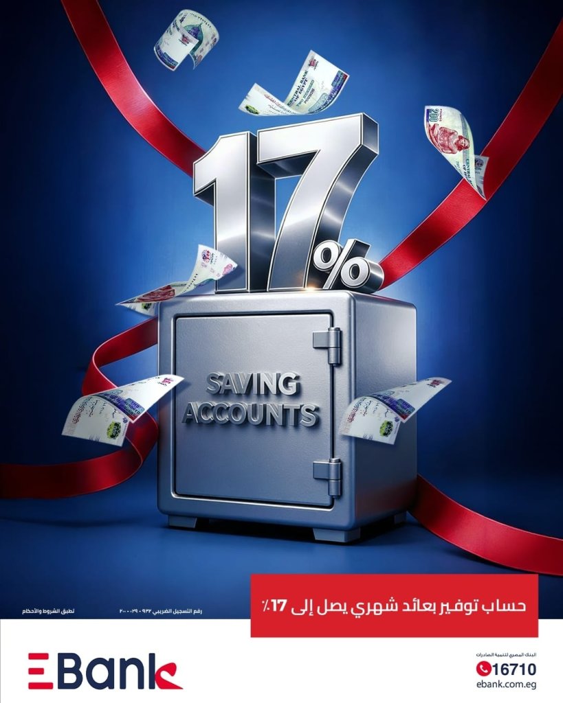 أعلن EBank عن إتاحة فتح حساب توفير جديد بعائد شهري تنافسي يصل إلى 17%، في إطار استراتيجيته المستمرة لتقديم حلول مصرفية مبتكرة تلبي تطلعات العملاء وتواكب متطلبات السوق المصرفي المصري.