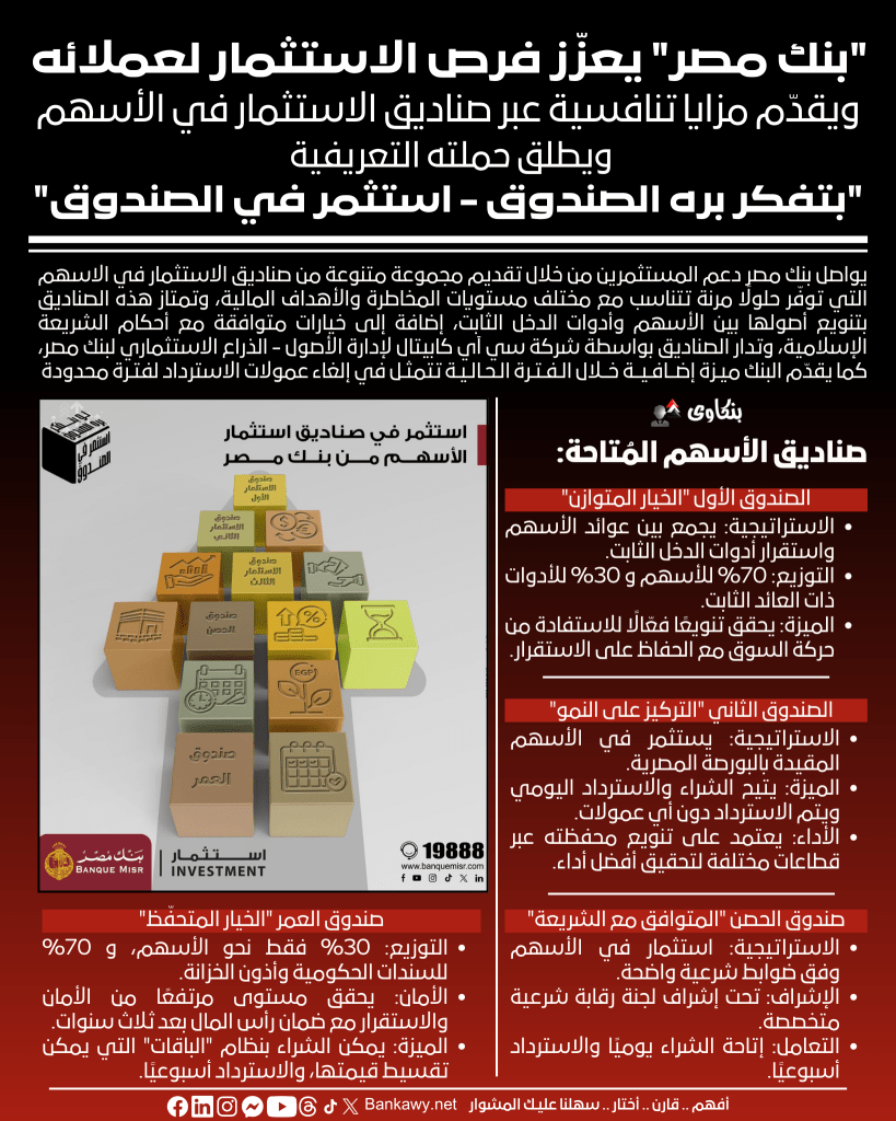 يواصل بنك مصر دعم المستثمرين من خلال تقديم مجموعة متنوعة من صناديق الاستثمار في الاسهم التي توفّر حلولًا مرنة تتناسب مع مختلف مستويات المخاطرة والأهداف المالية، وتمتاز هذه الصناديق بتنويع أصولها بين الأسهم وأدوات الدخل الثابت، إضافة إلى خيارات متوافقة مع أحكام الشريعة الإسلامية، وتدار الصناديق بواسطة شركة سي آي كابيتال لإدارة الأصول – الذراع الاستثماري لبنك مصر، كما يقدّم البنك ميزة إضافية خلال الفترة الحالية تتمثل في إلغاء عمولات الاسترداد لفترة محدودة.